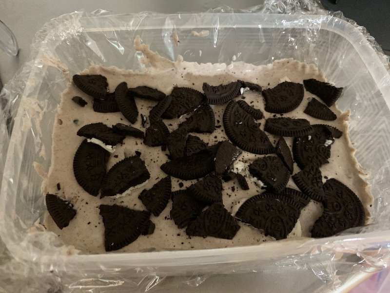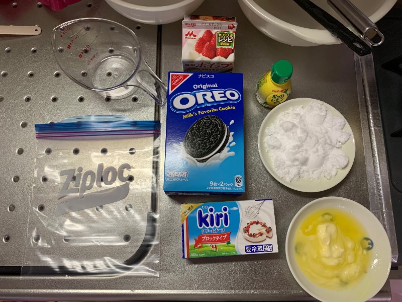 ジップロックの中でオレオと溶かしバターを混ぜて器の底に敷き詰めたり・・・(石がたくさん入っているように見えますね…)