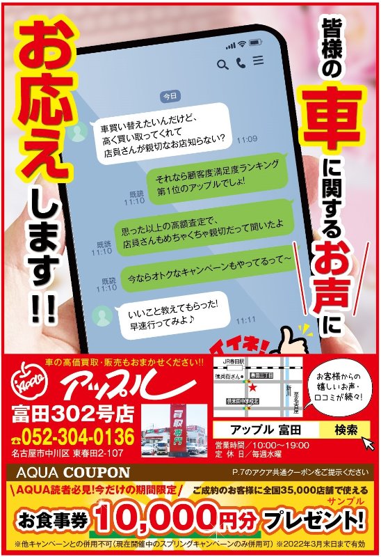 お車のご相談・ 査定だけでもOK! カンタン 入力 30秒 アップルがブランド買取始めました! お電話でも受付中! 受付時間AM10:00~PM7:00(毎週水曜日店休) 052-304-0136 お車のご相談・ 査定だけでもOK! カンタン 入力 30秒 アップルがブランド買取始めました! お電話でも受付中! 受付時間AM10:00~PM7:00(毎週水曜日店休) 052-304-0136 アップルがブランド買取始めました! お電話でも受付中! 受付時間AM10:00~PM7:00(毎週水曜日店休) 052-304-0136 店舗情報 在庫車 スタッフ紹介 ブログ お客様の声 キャンペーン 無料査定 click [ つぶやき ] 2022/01/28 (金) 12:59 情報誌AQUA発刊情報 皆様、こんにちは!アドバイザーの伊達です!本日のブログは、、、情報誌AQUAの発刊情報です!!!先日のブログで5000円分のお食事券をプレゼント!となっていたのですが、、、なんと、、、今回、期間限定で、、、、クーポンをご持参いただき、、、当店へお車をご売却頂くと、、、☆10000円分☆のお食事券をプレゼント致します!!!5000円もアップしておりますので今がチャンスです!!!期間は3月31日までとなっております!!今年も皆様に満足いただけるようスタッフ一同精一杯接客させて頂きます。また、現在キャンペーン中です!!春の買取祭 SPRING CAMPAIGN!1/5㈬~3/31㈭の期間中ご成約のお客様から抽選で総計330名様に当たります!!豪華賞品のラインナップはこちら!!↓↓↓A賞 旅行カタログギフト EXETIME15名様B賞 Dyson AM07 タワーファン5名様C賞 LEDランタン FLAME POD20名様D賞 Amazon Fire TV Stick(第3世代)40名様E賞 真空断熱マグカップ サーモス ステンレス350ml250名様ぜひこの機会に当店をご利用ください!!以上、伊達でした!! 2022-01-28 12:59:15 新しい記事へ 古い記事へ 最新記事 ☆GW休業のお知らせ☆☆お知らせ☆☆ナポリピッツァ☆☆臨時休業のお知らせ☆ゴンチャ 店舗情報に戻る 月別アーカイブ 2026年04月(6)2026年03月(6)2026年02月(9)2026年01月(7)2025年12月(9)2025年11月(13)2025年10月(6)2025年09月(12)2025年08月(17)2025年07月(11)2025年06月(7)2025年05月(20)2025年04月(10)2025年03月(7)2025年02月(6)2025年01月(8)2024年12月(12)2024年11月(14)2024年10月(14)2024年09月(20)2024年08月(15)2024年07月(18)2024年06月(17)2024年05月(18)2024年04月(15)2024年03月(15)2024年02月(13)2024年01月(10)2023年12月(5)2023年11月(8)2023年10月(8)2023年09月(3)2023年08月(16)2023年07月(8)2023年06月(10)2023年05月(11)2023年04月(9)2023年03月(3)2023年02月(5)2023年01月(4)2022年12月(4)2022年11月(6)2022年10月(4)2022年09月(9)2022年08月(9)2022年07月(8)2022年06月(9)2022年05月(7)2022年04月(8)2022年03月(6)2022年02月(3)2022年01月(8)2021年12月(7)2021年11月(14)2021年10月(14)2021年09月(14)2021年08月(22)2021年07月(22)2021年06月(22)2021年05月(21)2021年04月(20)2021年03月(8)2021年02月(8)2021年01月(6)2020年12月(9)2020年11月(11)2020年10月(7)2020年09月(11)2020年08月(22)2020年07月(26)2020年06月(26)2020年05月(22)2020年04月(25)2020年03月(25)2020年02月(25)2020年01月(22)2019年12月(14)2019年11月(12)2019年10月(11)2019年09月(4)2019年08月(12)2019年07月(9)2019年06月(20)2019年05月(22)2019年04月(7)2019年03月(5)2019年02月(3)2019年01月(1)2018年12月(5)2018年11月(4)2018年10月(3)2018年09月(9)2018年08月(7)2018年07月(8)2018年06月(7)2018年05月(9)2018年04月(7)2018年03月(4)2018年02月(5)2018年01月(13)2017年12月(5)2017年11月(10)2017年10月(7)2017年09月(5)2017年08月(4)2017年07月(4)2017年06月(2)2017年05月(5)2017年04月(5)2017年03月(1)2017年02月(2)2017年01月(7)2016年12月(2)2016年11月(2)2016年10月(4)2016年09月(3)2016年08月(8)2016年07月(4)2016年06月(3)2016年05月(4)2016年04月(3)2016年03月(2)2016年02月(1)2016年01月(6)2015年12月(4)2015年11月(1)2015年10月(3)2015年09月(4)2015年08月(1)2015年06月(2)2015年05月(2)2015年04月(4)2015年03月(1)2015年02月(4)2015年01月(3)2014年12月(3)2014年11月(4)2014年10月(3)2014年09月(6)2014年08月(8)2014年07月(8)2014年06月(10)2014年05月(7)2014年04月(4)2014年03月(1)2014年02月(1)2014年01月(2)2013年12月(3)2013年10月(1)2013年09月(1)