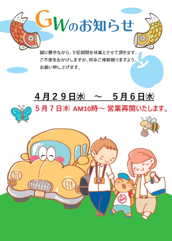 お車のご相談・ 査定だけでもOK! カンタン 入力 30秒 アップルがブランド買取始めました! お電話でも受付中! 受付時間AM10:00~PM7:00(毎週水曜日店休) 052-304-0136 お車のご相談・ 査定だけでもOK! カンタン 入力 30秒 アップルがブランド買取始めました! お電話でも受付中! 受付時間AM10:00~PM7:00(毎週水曜日店休) 052-304-0136 アップルがブランド買取始めました! お電話でも受付中! 受付時間AM10:00~PM7:00(毎週水曜日店休) 052-304-0136 店舗情報 在庫車 スタッフ紹介 ブログ お客様の声 キャンペーン 無料査定 click [ 未分類 ] 2026/04/23 (木) 12:58 ☆GW休業のお知らせ☆ 皆様こんにちは!アップル富田店の岩田です(=゚ω゚)ノ21日は臨時休業を頂いており、ご来店を予定されていた方にはご不便・ご迷惑をおかけしました。本日より営業再開しております!あいにくの雨模様ですが、雨に濡れないよう屋根がある場所で皆様の大切なお車を査定いたしますので、皆様のご来店お待ちしております!・・・さて、今回はGW休業のお知らせです!早いものでもうGWですね!休業のお知らせが連続してしまい申し訳ございませんが、当店では4/29㈬~5/6㈬までGW休業とさせていただきます。皆様にはご不便・ご迷惑をおかけしますが、何卒よろしくお願い申し上げます。5月7日㈭ AM10時から営業再開いたします。よろしくお願いいたします。以上、岩田でした(=゚ω゚)ノ 2026-04-23 12:58:45 新しい記事へ 古い記事へ 最新記事 ☆GW休業のお知らせ☆☆お知らせ☆☆ナポリピッツァ☆☆臨時休業のお知らせ☆ゴンチャ 店舗情報に戻る 月別アーカイブ 2026年04月(6)2026年03月(6)2026年02月(9)2026年01月(7)2025年12月(9)2025年11月(13)2025年10月(6)2025年09月(12)2025年08月(17)2025年07月(11)2025年06月(7)2025年05月(20)2025年04月(10)2025年03月(7)2025年02月(6)2025年01月(8)2024年12月(12)2024年11月(14)2024年10月(14)2024年09月(20)2024年08月(15)2024年07月(18)2024年06月(17)2024年05月(18)2024年04月(15)2024年03月(15)2024年02月(13)2024年01月(10)2023年12月(5)2023年11月(8)2023年10月(8)2023年09月(3)2023年08月(16)2023年07月(8)2023年06月(10)2023年05月(11)2023年04月(9)2023年03月(3)2023年02月(5)2023年01月(4)2022年12月(4)2022年11月(6)2022年10月(4)2022年09月(9)2022年08月(9)2022年07月(8)2022年06月(9)2022年05月(7)2022年04月(8)2022年03月(6)2022年02月(3)2022年01月(8)2021年12月(7)2021年11月(14)2021年10月(14)2021年09月(14)2021年08月(22)2021年07月(22)2021年06月(22)2021年05月(21)2021年04月(20)2021年03月(8)2021年02月(8)2021年01月(6)2020年12月(9)2020年11月(11)2020年10月(7)2020年09月(11)2020年08月(22)2020年07月(26)2020年06月(26)2020年05月(22)2020年04月(25)2020年03月(25)2020年02月(25)2020年01月(22)2019年12月(14)2019年11月(12)2019年10月(11)2019年09月(4)2019年08月(12)2019年07月(9)2019年06月(20)2019年05月(22)2019年04月(7)2019年03月(5)2019年02月(3)2019年01月(1)2018年12月(5)2018年11月(4)2018年10月(3)2018年09月(9)2018年08月(7)2018年07月(8)2018年06月(7)2018年05月(9)2018年04月(7)2018年03月(4)2018年02月(5)2018年01月(13)2017年12月(5)2017年11月(10)2017年10月(7)2017年09月(5)2017年08月(4)2017年07月(4)2017年06月(2)2017年05月(5)2017年04月(5)2017年03月(1)2017年02月(2)2017年01月(7)2016年12月(2)2016年11月(2)2016年10月(4)2016年09月(3)2016年08月(8)2016年07月(4)2016年06月(3)2016年05月(4)2016年04月(3)2016年03月(2)2016年02月(1)2016年01月(6)2015年12月(4)2015年11月(1)2015年10月(3)2015年09月(4)2015年08月(1)2015年06月(2)2015年05月(2)2015年04月(4)2015年03月(1)2015年02月(4)2015年01月(3)2014年12月(3)2014年11月(4)2014年10月(3)2014年09月(6)2014年08月(8)2014年07月(8)2014年06月(10)2014年05月(7)2014年04月(4)2014年03月(1)2014年02月(1)2014年01月(2)2013年12月(3)2013年10月(1)2013年09月(1)