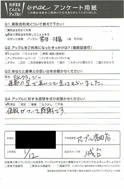 お車のご相談・ 査定だけでもOK! カンタン 入力 30秒 アップルがブランド買取始めました! お電話でも受付中! 受付時間AM10:00~PM7:00(毎週水曜日店休) 052-304-0136 お車のご相談・ 査定だけでもOK! カンタン 入力 30秒 アップルがブランド買取始めました! お電話でも受付中! 受付時間AM10:00~PM7:00(毎週水曜日店休) 052-304-0136 アップルがブランド買取始めました! お電話でも受付中! 受付時間AM10:00~PM7:00(毎週水曜日店休) 052-304-0136 店舗情報 在庫車 スタッフ紹介 ブログ お客様の声 キャンペーン 無料査定 click お客様の声 ご記入日: 2021/01/12 匿名様 車名:三菱 eKクラッシィ 思い出:通勤の足で長い事走ってもらいました。感想:大満足 値段がついて感謝です。 前へ 次へ お客様の声一覧を見る