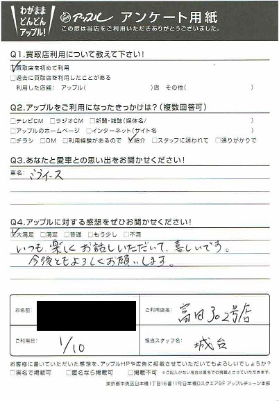 お車のご相談・ 査定だけでもOK! カンタン 入力 30秒 アップルがブランド買取始めました! お電話でも受付中! 受付時間AM10:00~PM7:00(毎週水曜日店休) 052-304-0136 お車のご相談・ 査定だけでもOK! カンタン 入力 30秒 アップルがブランド買取始めました! お電話でも受付中! 受付時間AM10:00~PM7:00(毎週水曜日店休) 052-304-0136 アップルがブランド買取始めました! お電話でも受付中! 受付時間AM10:00~PM7:00(毎週水曜日店休) 052-304-0136 店舗情報 在庫車 スタッフ紹介 ブログ お客様の声 キャンペーン 無料査定 click お客様の声 ご記入日: 2021/01/10 匿名様 車名:ダイハツ ミライース 感想:大満足 いつも楽しくお話いただいてうれしいです。 今後ともよろしくお願いします。 前へ 次へ お客様の声一覧を見る