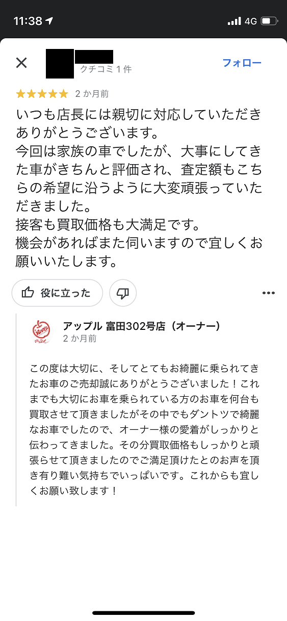いつも店長には親切に対応して頂きあるがとうございます。今回は家族の車でしたが大事にした車がきちんと評価され、査定額もこちらの希望に沿うように大変に頑張っていただきました。接客も買取価格も大満足です。機会があればまた伺いますので宜しくお願い致します。