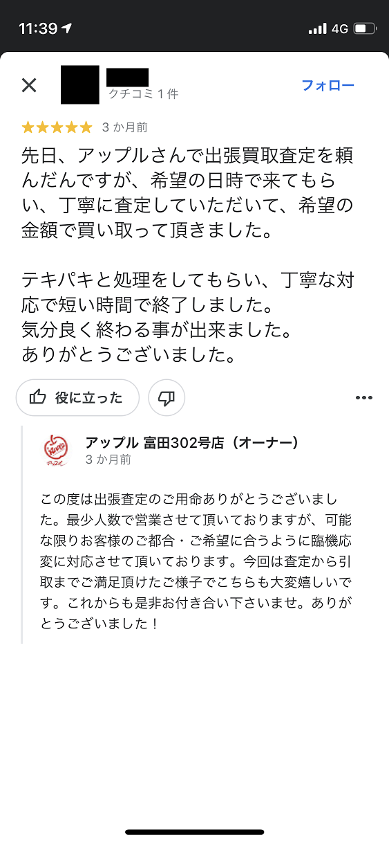 先日、アップルさんで出張買取査定を頼んだのですが、希望日時で来てもらい、丁寧に査定していただいて、希望の金額で買い取って頂きました。