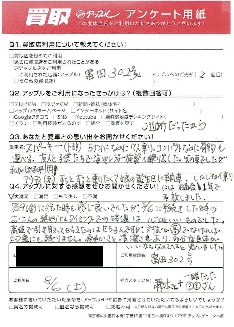 感想:7/29(金)に行った時も感じ良いでしたが8/6に手続きした時のお二人の絶妙なタイミングでの接遇は心地の良い物でした。高値で引き取ってもらえたのはもちろんですが、対応が(高)でなければ印象にも残りません。爽やかさと清潔さもあり多分見せ自体がいいからなのではと思いました。