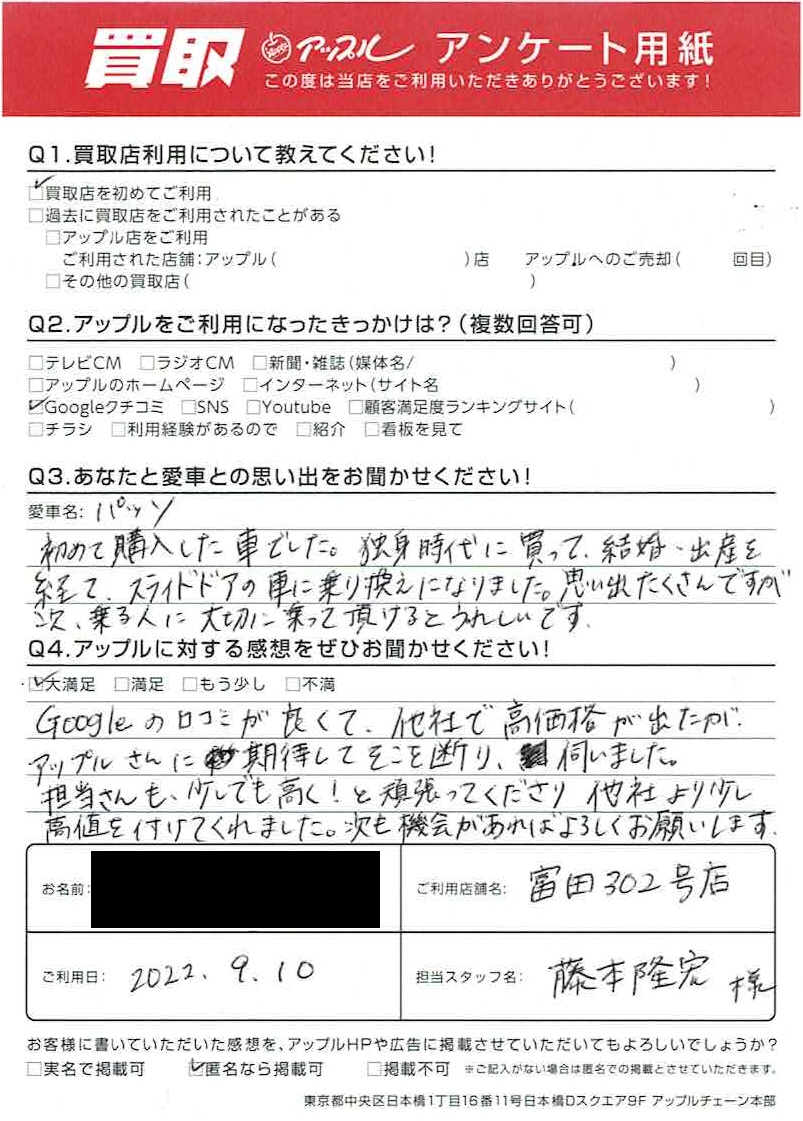 グーグルの口コミが良くて、他社で高価格が出たがアップルさんに期待してそこを断り、お伺いしました。担当