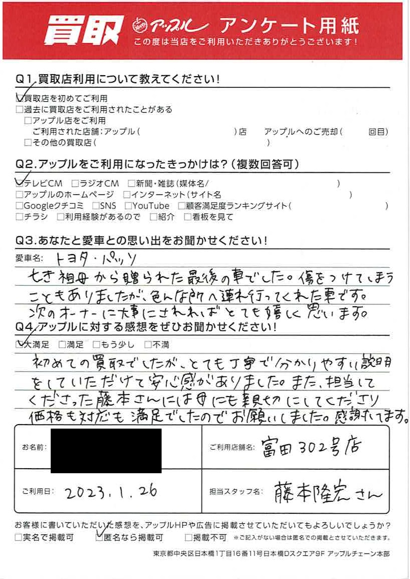 くださった藤本さんには母にも親切にしてくださり価格も対応も満足でしたのでお願い致しました。感謝してま