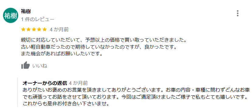 お車のご相談・ 査定だけでもOK! カンタン 入力 30秒 アップルがブランド買取始めました! お電話でも受付中! 受付時間AM10:00~PM7:00(毎週水曜日店休) 052-304-0136 お車のご相談・ 査定だけでもOK! カンタン 入力 30秒 アップルがブランド買取始めました! お電話でも受付中! 受付時間AM10:00~PM7:00(毎週水曜日店休) 052-304-0136 アップルがブランド買取始めました! お電話でも受付中! 受付時間AM10:00~PM7:00(毎週水曜日店休) 052-304-0136 店舗情報 在庫車 スタッフ紹介 ブログ お客様の声 キャンペーン 無料査定 click お客様の声 ご記入日: 2023/03/15 祐樹様 親切に対応していただいて、予想以上に価格で買い取っていただきました。古い軽自動車だったのですが、良かったです。また機会があればお願いしたいです。 前へ 次へ お客様の声一覧を見る