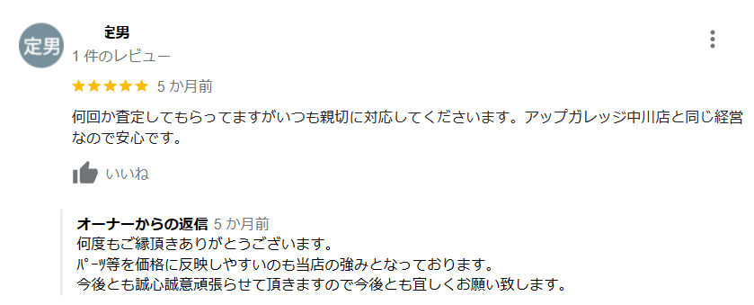 お車のご相談・ 査定だけでもOK! カンタン 入力 30秒 アップルがブランド買取始めました! お電話でも受付中! 受付時間AM10:00~PM7:00(毎週水曜日店休) 052-304-0136 お車のご相談・ 査定だけでもOK! カンタン 入力 30秒 アップルがブランド買取始めました! お電話でも受付中! 受付時間AM10:00~PM7:00(毎週水曜日店休) 052-304-0136 アップルがブランド買取始めました! お電話でも受付中! 受付時間AM10:00~PM7:00(毎週水曜日店休) 052-304-0136 店舗情報 在庫車 スタッフ紹介 ブログ お客様の声 キャンペーン 無料査定 click お客様の声 ご記入日: 2023/01/18 定男様 何回か査定してもらってますがいつも親切に対応してくださいます。アップガレージ中川店と同じ経営なので安心です。 前へ 次へ お客様の声一覧を見る