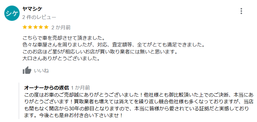 色々な車屋さんを回りましたが、対応、査定額等、全てがとても満足できました。