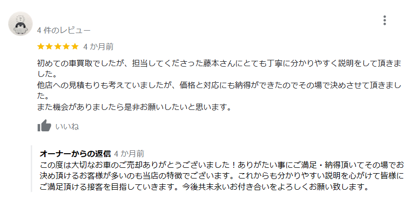 初めての車買取でしたが、担当してくださった藤本さんにとても丁寧にわかりやすく説明をしていただきました。