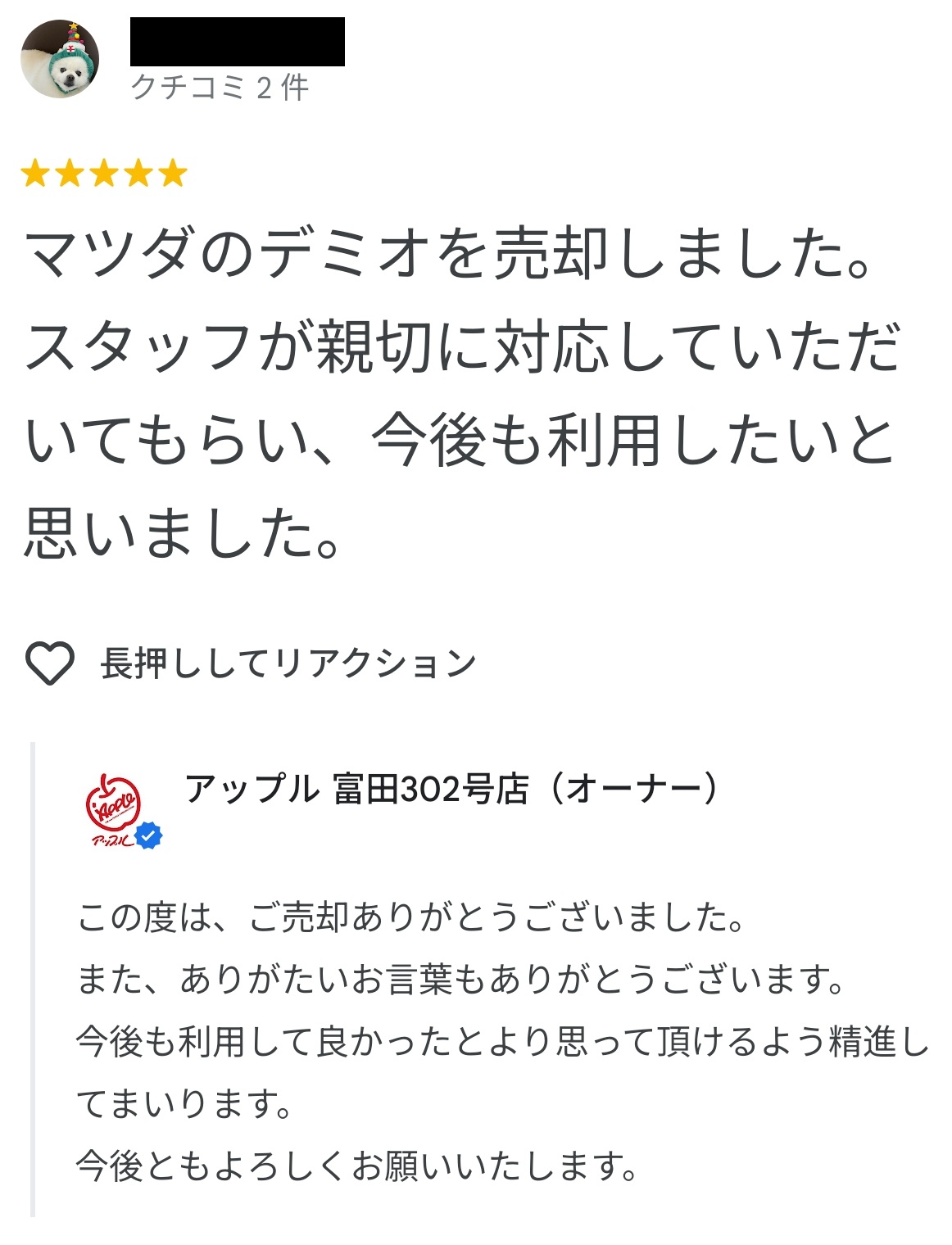 お車のご相談・ 査定だけでもOK! カンタン 入力 30秒 アップルがブランド買取始めました! お電話でも受付中! 受付時間AM10:00~PM7:00(毎週水曜日店休) 052-304-0136 お車のご相談・ 査定だけでもOK! カンタン 入力 30秒 アップルがブランド買取始めました! お電話でも受付中! 受付時間AM10:00~PM7:00(毎週水曜日店休) 052-304-0136 アップルがブランド買取始めました! お電話でも受付中! 受付時間AM10:00~PM7:00(毎週水曜日店休) 052-304-0136 店舗情報 在庫車 スタッフ紹介 ブログ お客様の声 キャンペーン 無料査定 click お客様の声 ご記入日: 2025/10/08 T・Y様 マツダのデミオを売却しました。スタッフが親切に対応していただいてもらい、今後も利用したいと思いました。 前へ 次へ お客様の声一覧を見る