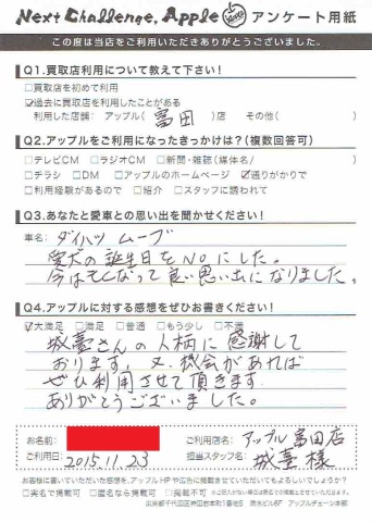 お車のご相談・ 査定だけでもOK! カンタン 入力 30秒 アップルがブランド買取始めました! お電話でも受付中! 受付時間AM10:00~PM7:00(毎週水曜日店休) 052-304-0136 お車のご相談・ 査定だけでもOK! カンタン 入力 30秒 アップルがブランド買取始めました! お電話でも受付中! 受付時間AM10:00~PM7:00(毎週水曜日店休) 052-304-0136 アップルがブランド買取始めました! お電話でも受付中! 受付時間AM10:00~PM7:00(毎週水曜日店休) 052-304-0136 店舗情報 在庫車 スタッフ紹介 ブログ お客様の声 キャンペーン 無料査定 click お客様の声 ご記入日: 2015/11/23 匿名希望ムーヴ様 城臺さんの人柄に感謝しております。又機会があればぜひ利用させて頂きます。ありがとうございまいた。 前へ 次へ お客様の声一覧を見る