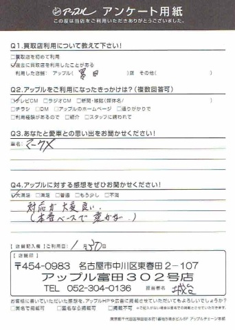 お車のご相談・ 査定だけでもOK! カンタン 入力 30秒 アップルがブランド買取始めました! お電話でも受付中! 受付時間AM10:00~PM7:00(毎週水曜日店休) 052-304-0136 お車のご相談・ 査定だけでもOK! カンタン 入力 30秒 アップルがブランド買取始めました! お電話でも受付中! 受付時間AM10:00~PM7:00(毎週水曜日店休) 052-304-0136 アップルがブランド買取始めました! お電話でも受付中! 受付時間AM10:00~PM7:00(毎週水曜日店休) 052-304-0136 店舗情報 在庫車 スタッフ紹介 ブログ お客様の声 キャンペーン 無料査定 click お客様の声 ご記入日: 2016/01/30 匿名希望マークX様 対応が大変良い。(本音ベースで裏がない) 前へ 次へ お客様の声一覧を見る