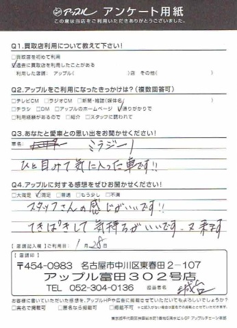 お車のご相談・ 査定だけでもOK! カンタン 入力 30秒 アップルがブランド買取始めました! お電話でも受付中! 受付時間AM10:00~PM7:00(毎週水曜日店休) 052-304-0136 お車のご相談・ 査定だけでもOK! カンタン 入力 30秒 アップルがブランド買取始めました! お電話でも受付中! 受付時間AM10:00~PM7:00(毎週水曜日店休) 052-304-0136 アップルがブランド買取始めました! お電話でも受付中! 受付時間AM10:00~PM7:00(毎週水曜日店休) 052-304-0136 店舗情報 在庫車 スタッフ紹介 ブログ お客様の声 キャンペーン 無料査定 click お客様の声 ご記入日: 2016/01/28 匿名希望ミラジーノ様 スタッフさんの感じがいいです!!てきぱきして気持ちがいいです。又、来ます。 前へ 次へ お客様の声一覧を見る