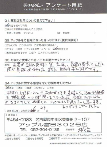 お車のご相談・ 査定だけでもOK! カンタン 入力 30秒 アップルがブランド買取始めました! お電話でも受付中! 受付時間AM10:00~PM7:00(毎週水曜日店休) 052-304-0136 お車のご相談・ 査定だけでもOK! カンタン 入力 30秒 アップルがブランド買取始めました! お電話でも受付中! 受付時間AM10:00~PM7:00(毎週水曜日店休) 052-304-0136 アップルがブランド買取始めました! お電話でも受付中! 受付時間AM10:00~PM7:00(毎週水曜日店休) 052-304-0136 店舗情報 在庫車 スタッフ紹介 ブログ お客様の声 キャンペーン 無料査定 click お客様の声 ご記入日: 2016/01/24 匿名希望様 担当のじょうだいさんの対応がとても素晴らしく、こちらの無理も嫌な顔一つせず聞いてくださいました。今後もアップルさんの口コミをして次回も又アップルさんで売りたいと思います。ありがとうございました。 前へ 次へ お客様の声一覧を見る