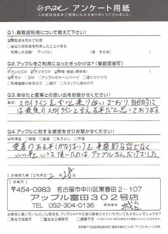 お車のご相談・ 査定だけでもOK! カンタン 入力 30秒 アップルがブランド買取始めました! お電話でも受付中! 受付時間AM10:00~PM7:00(毎週水曜日店休) 052-304-0136 お車のご相談・ 査定だけでもOK! カンタン 入力 30秒 アップルがブランド買取始めました! お電話でも受付中! 受付時間AM10:00~PM7:00(毎週水曜日店休) 052-304-0136 アップルがブランド買取始めました! お電話でも受付中! 受付時間AM10:00~PM7:00(毎週水曜日店休) 052-304-0136 店舗情報 在庫車 スタッフ紹介 ブログ お客様の声 キャンペーン 無料査定 click お客様の声 ご記入日: 2016/02/28 匿名希望スカイライン様 愛着のある車(かなり古い)を事務的な話でなく、いい車と言って頂いたのはアップルさんだけでした。 前へ 次へ お客様の声一覧を見る