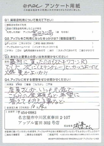 お車のご相談・ 査定だけでもOK! カンタン 入力 30秒 アップルがブランド買取始めました! お電話でも受付中! 受付時間AM10:00~PM7:00(毎週水曜日店休) 052-304-0136 お車のご相談・ 査定だけでもOK! カンタン 入力 30秒 アップルがブランド買取始めました! お電話でも受付中! 受付時間AM10:00~PM7:00(毎週水曜日店休) 052-304-0136 アップルがブランド買取始めました! お電話でも受付中! 受付時間AM10:00~PM7:00(毎週水曜日店休) 052-304-0136 店舗情報 在庫車 スタッフ紹介 ブログ お客様の声 キャンペーン 無料査定 click お客様の声 ご記入日: 2016/10/14 匿名希望スティングレー様 店員さんがいつも元気でこちらの金額等希望に答えてもらえる事など。 前へ 次へ お客様の声一覧を見る