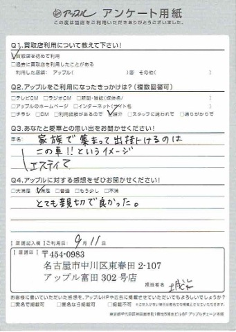 お車のご相談・ 査定だけでもOK! カンタン 入力 30秒 アップルがブランド買取始めました! お電話でも受付中! 受付時間AM10:00~PM7:00(毎週水曜日店休) 052-304-0136 お車のご相談・ 査定だけでもOK! カンタン 入力 30秒 アップルがブランド買取始めました! お電話でも受付中! 受付時間AM10:00~PM7:00(毎週水曜日店休) 052-304-0136 アップルがブランド買取始めました! お電話でも受付中! 受付時間AM10:00~PM7:00(毎週水曜日店休) 052-304-0136 店舗情報 在庫車 スタッフ紹介 ブログ お客様の声 キャンペーン 無料査定 click お客様の声 ご記入日: 2016/09/11 匿名希望エスティマ様 とても親切で良かった。 前へ 次へ お客様の声一覧を見る