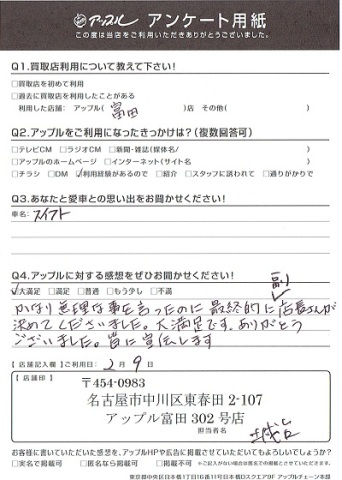 お車のご相談・ 査定だけでもOK! カンタン 入力 30秒 アップルがブランド買取始めました! お電話でも受付中! 受付時間AM10:00~PM7:00(毎週水曜日店休) 052-304-0136 お車のご相談・ 査定だけでもOK! カンタン 入力 30秒 アップルがブランド買取始めました! お電話でも受付中! 受付時間AM10:00~PM7:00(毎週水曜日店休) 052-304-0136 アップルがブランド買取始めました! お電話でも受付中! 受付時間AM10:00~PM7:00(毎週水曜日店休) 052-304-0136 店舗情報 在庫車 スタッフ紹介 ブログ お客様の声 キャンペーン 無料査定 click お客様の声 ご記入日: 2017/02/09 匿名希望スイフト様 かなり無理な事を言ったのに最終的に副店長さんが決めてくださいました。大満足です。ありがとうございました。皆に宣伝します。 前へ 次へ お客様の声一覧を見る