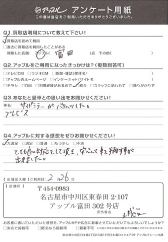 お車のご相談・ 査定だけでもOK! カンタン 入力 30秒 アップルがブランド買取始めました! お電話でも受付中! 受付時間AM10:00~PM7:00(毎週水曜日店休) 052-304-0136 お車のご相談・ 査定だけでもOK! カンタン 入力 30秒 アップルがブランド買取始めました! お電話でも受付中! 受付時間AM10:00~PM7:00(毎週水曜日店休) 052-304-0136 アップルがブランド買取始めました! お電話でも受付中! 受付時間AM10:00~PM7:00(毎週水曜日店休) 052-304-0136 店舗情報 在庫車 スタッフ紹介 ブログ お客様の声 キャンペーン 無料査定 click お客様の声 ご記入日: 2017/02/26 匿名希望ブレビス様 とても良い対応をして頂き安心して車を手放す事が出来ました。 前へ 次へ お客様の声一覧を見る