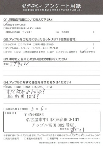 お車のご相談・ 査定だけでもOK! カンタン 入力 30秒 アップルがブランド買取始めました! お電話でも受付中! 受付時間AM10:00~PM7:00(毎週水曜日店休) 052-304-0136 お車のご相談・ 査定だけでもOK! カンタン 入力 30秒 アップルがブランド買取始めました! お電話でも受付中! 受付時間AM10:00~PM7:00(毎週水曜日店休) 052-304-0136 アップルがブランド買取始めました! お電話でも受付中! 受付時間AM10:00~PM7:00(毎週水曜日店休) 052-304-0136 店舗情報 在庫車 スタッフ紹介 ブログ お客様の声 キャンペーン 無料査定 click お客様の声 ご記入日: 2017/03/05 匿名棒エブリィ様 すごく対応が良かった!また利用します! 前へ 次へ お客様の声一覧を見る