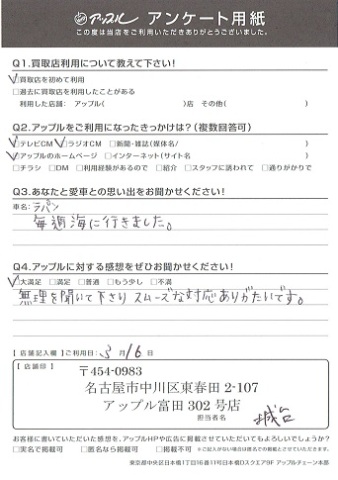 お車のご相談・ 査定だけでもOK! カンタン 入力 30秒 アップルがブランド買取始めました! お電話でも受付中! 受付時間AM10:00~PM7:00(毎週水曜日店休) 052-304-0136 お車のご相談・ 査定だけでもOK! カンタン 入力 30秒 アップルがブランド買取始めました! お電話でも受付中! 受付時間AM10:00~PM7:00(毎週水曜日店休) 052-304-0136 アップルがブランド買取始めました! お電話でも受付中! 受付時間AM10:00~PM7:00(毎週水曜日店休) 052-304-0136 店舗情報 在庫車 スタッフ紹介 ブログ お客様の声 キャンペーン 無料査定 click お客様の声 ご記入日: 2017/03/16 匿名希望ラパン様 無理を聞いてくださりスムーズな対応でありがたいです。 前へ 次へ お客様の声一覧を見る