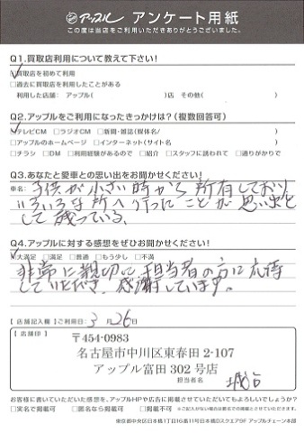 お車のご相談・ 査定だけでもOK! カンタン 入力 30秒 アップルがブランド買取始めました! お電話でも受付中! 受付時間AM10:00~PM7:00(毎週水曜日店休) 052-304-0136 お車のご相談・ 査定だけでもOK! カンタン 入力 30秒 アップルがブランド買取始めました! お電話でも受付中! 受付時間AM10:00~PM7:00(毎週水曜日店休) 052-304-0136 アップルがブランド買取始めました! お電話でも受付中! 受付時間AM10:00~PM7:00(毎週水曜日店休) 052-304-0136 店舗情報 在庫車 スタッフ紹介 ブログ お客様の声 キャンペーン 無料査定 click お客様の声 ご記入日: 2017/03/26 匿名希望様 非常に親切で担当者の方に応対して頂き、感謝しています。 前へ 次へ お客様の声一覧を見る