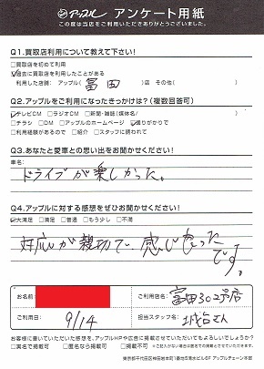 お車のご相談・ 査定だけでもOK! カンタン 入力 30秒 アップルがブランド買取始めました! お電話でも受付中! 受付時間AM10:00~PM7:00(毎週水曜日店休) 052-304-0136 お車のご相談・ 査定だけでもOK! カンタン 入力 30秒 アップルがブランド買取始めました! お電話でも受付中! 受付時間AM10:00~PM7:00(毎週水曜日店休) 052-304-0136 アップルがブランド買取始めました! お電話でも受付中! 受付時間AM10:00~PM7:00(毎週水曜日店休) 052-304-0136 店舗情報 在庫車 スタッフ紹介 ブログ お客様の声 キャンペーン 無料査定 click お客様の声 ご記入日: 2017/09/14 匿名希望様 対応が親切で感じよかったです。 前へ 次へ お客様の声一覧を見る