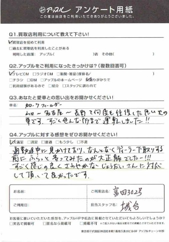 お車のご相談・ 査定だけでもOK! カンタン 入力 30秒 アップルがブランド買取始めました! お電話でも受付中! 受付時間AM10:00~PM7:00(毎週水曜日店休) 052-304-0136 お車のご相談・ 査定だけでもOK! カンタン 入力 30秒 アップルがブランド買取始めました! お電話でも受付中! 受付時間AM10:00~PM7:00(毎週水曜日店休) 052-304-0136 アップルがブランド買取始めました! お電話でも受付中! 受付時間AM10:00~PM7:00(毎週水曜日店休) 052-304-0136 店舗情報 在庫車 スタッフ紹介 ブログ お客様の声 キャンペーン 無料査定 click お客様の声 ご記入日: 2017/11/02 匿名希望カローラフィールダー様 通勤途中で見かけておりなんとなくディーラー下取する前にふらっと寄ってみたのが大正解でしたー!!凄く感じの良くさわやかな城台さんに対応して頂いてよかったです! 前へ 次へ お客様の声一覧を見る