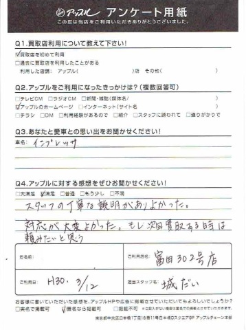 お車のご相談・ 査定だけでもOK! カンタン 入力 30秒 アップルがブランド買取始めました! お電話でも受付中! 受付時間AM10:00~PM7:00(毎週水曜日店休) 052-304-0136 お車のご相談・ 査定だけでもOK! カンタン 入力 30秒 アップルがブランド買取始めました! お電話でも受付中! 受付時間AM10:00~PM7:00(毎週水曜日店休) 052-304-0136 アップルがブランド買取始めました! お電話でも受付中! 受付時間AM10:00~PM7:00(毎週水曜日店休) 052-304-0136 店舗情報 在庫車 スタッフ紹介 ブログ お客様の声 キャンペーン 無料査定 click お客様の声 ご記入日: 2018/03/12 匿名希望インプレッサ様 スタッフの丁寧な説明があり良かった。対応が大変良かった。もし次回買取する時は頼みたいと思う 前へ 次へ お客様の声一覧を見る