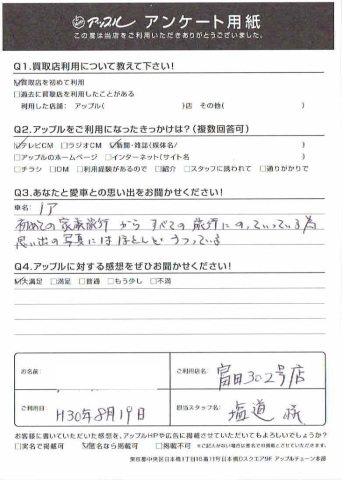 お車のご相談・ 査定だけでもOK! カンタン 入力 30秒 アップルがブランド買取始めました! お電話でも受付中! 受付時間AM10:00~PM7:00(毎週水曜日店休) 052-304-0136 お車のご相談・ 査定だけでもOK! カンタン 入力 30秒 アップルがブランド買取始めました! お電話でも受付中! 受付時間AM10:00~PM7:00(毎週水曜日店休) 052-304-0136 アップルがブランド買取始めました! お電話でも受付中! 受付時間AM10:00~PM7:00(毎週水曜日店休) 052-304-0136 店舗情報 在庫車 スタッフ紹介 ブログ お客様の声 キャンペーン 無料査定 click お客様の声 ご記入日: 2018/08/19 匿名希望ノア様 初めての家族旅行からすべての旅行に乗っている為思い出の写真にはほとんど写っている 前へ 次へ お客様の声一覧を見る