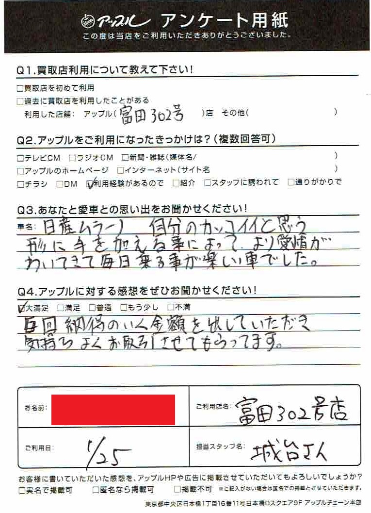 お車のご相談・ 査定だけでもOK! カンタン 入力 30秒 アップルがブランド買取始めました! お電話でも受付中! 受付時間AM10:00~PM7:00(毎週水曜日店休) 052-304-0136 お車のご相談・ 査定だけでもOK! カンタン 入力 30秒 アップルがブランド買取始めました! お電話でも受付中! 受付時間AM10:00~PM7:00(毎週水曜日店休) 052-304-0136 アップルがブランド買取始めました! お電話でも受付中! 受付時間AM10:00~PM7:00(毎週水曜日店休) 052-304-0136 店舗情報 在庫車 スタッフ紹介 ブログ お客様の声 キャンペーン 無料査定 click お客様の声 ご記入日: 2019/01/25 匿名希望ムラーノ様 車名:日産 ムラーノ 自分のカッコいいと思う形に手を加える事によってより愛情が湧いてきて毎日乗る事が楽しい車でした。毎回納得いく金額を出していただき気持ちよくお取引させてもらってます。 前へ 次へ お客様の声一覧を見る