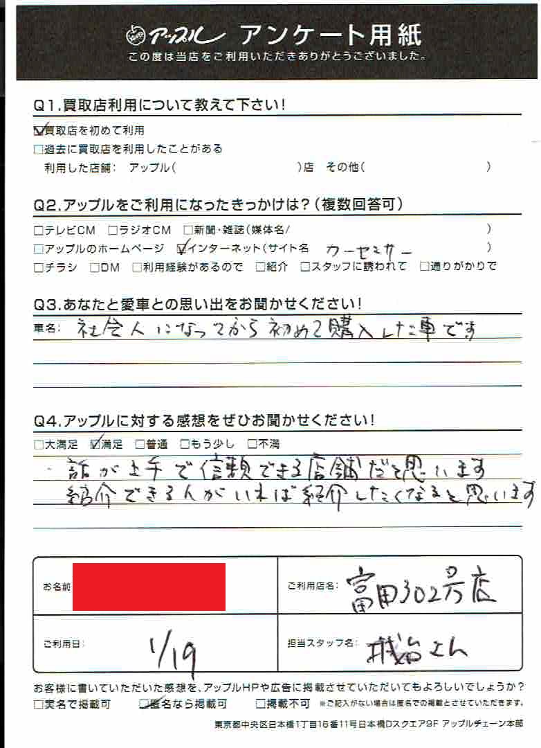 お車のご相談・ 査定だけでもOK! カンタン 入力 30秒 アップルがブランド買取始めました! お電話でも受付中! 受付時間AM10:00~PM7:00(毎週水曜日店休) 052-304-0136 お車のご相談・ 査定だけでもOK! カンタン 入力 30秒 アップルがブランド買取始めました! お電話でも受付中! 受付時間AM10:00~PM7:00(毎週水曜日店休) 052-304-0136 アップルがブランド買取始めました! お電話でも受付中! 受付時間AM10:00~PM7:00(毎週水曜日店休) 052-304-0136 店舗情報 在庫車 スタッフ紹介 ブログ お客様の声 キャンペーン 無料査定 click お客様の声 ご記入日: 2019/01/19 匿名希望キューブ様 車名:日産 キューブ 社会人になってから初めて購入した車です。話が上手で信頼出来る店舗だと思います。紹介出来る人がいれば紹介したくなると思います。 前へ 次へ お客様の声一覧を見る