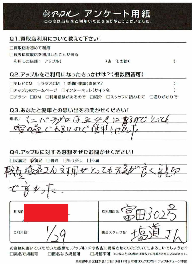 お車のご相談・ 査定だけでもOK! カンタン 入力 30秒 アップルがブランド買取始めました! お電話でも受付中! 受付時間AM10:00~PM7:00(毎週水曜日店休) 052-304-0136 お車のご相談・ 査定だけでもOK! カンタン 入力 30秒 アップルがブランド買取始めました! お電話でも受付中! 受付時間AM10:00~PM7:00(毎週水曜日店休) 052-304-0136 アップルがブランド買取始めました! お電話でも受付中! 受付時間AM10:00~PM7:00(毎週水曜日店休) 052-304-0136 店舗情報 在庫車 スタッフ紹介 ブログ お客様の声 キャンペーン 無料査定 click お客様の声 ご記入日: 2019/01/29 匿名希望パジェロミニ様 車名:三菱 パジェロミニ 塩道さんの対応がとっても元気がよく、親切で良かった。 前へ 次へ お客様の声一覧を見る