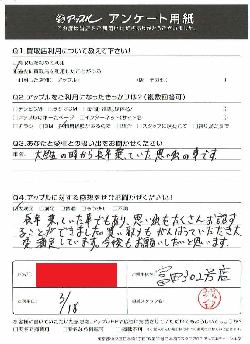 お車のご相談・ 査定だけでもOK! カンタン 入力 30秒 アップルがブランド買取始めました! お電話でも受付中! 受付時間AM10:00~PM7:00(毎週水曜日店休) 052-304-0136 お車のご相談・ 査定だけでもOK! カンタン 入力 30秒 アップルがブランド買取始めました! お電話でも受付中! 受付時間AM10:00~PM7:00(毎週水曜日店休) 052-304-0136 アップルがブランド買取始めました! お電話でも受付中! 受付時間AM10:00~PM7:00(毎週水曜日店休) 052-304-0136 店舗情報 在庫車 スタッフ紹介 ブログ お客様の声 キャンペーン 無料査定 click お客様の声 ご記入日: 2019/03/18 匿名希望カローラフィールダー様 車名:トヨタ カローラフィールダー フィールダー(カローラ) 長年乗っていた車でもあり、思い出をたくさんお話しすることができました。買取もがんばっていただき大変満足しています。今後もお願いしたいと思います。 前へ 次へ お客様の声一覧を見る