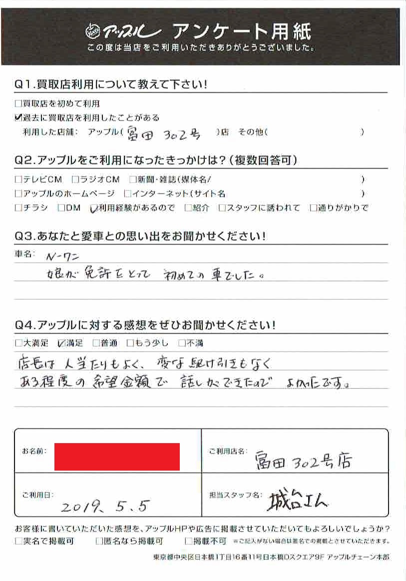 お車のご相談・ 査定だけでもOK! カンタン 入力 30秒 アップルがブランド買取始めました! お電話でも受付中! 受付時間AM10:00~PM7:00(毎週水曜日店休) 052-304-0136 お車のご相談・ 査定だけでもOK! カンタン 入力 30秒 アップルがブランド買取始めました! お電話でも受付中! 受付時間AM10:00~PM7:00(毎週水曜日店休) 052-304-0136 アップルがブランド買取始めました! お電話でも受付中! 受付時間AM10:00~PM7:00(毎週水曜日店休) 052-304-0136 店舗情報 在庫車 スタッフ紹介 ブログ お客様の声 キャンペーン 無料査定 click お客様の声 ご記入日: 2019/05/05 匿名希望N-ONE様 車名:ホンダ N-ONE 店長は人当たりもよく、変な駆け引きもなくある程度の希望金額で話が出来たので良かったです。 前へ 次へ お客様の声一覧を見る