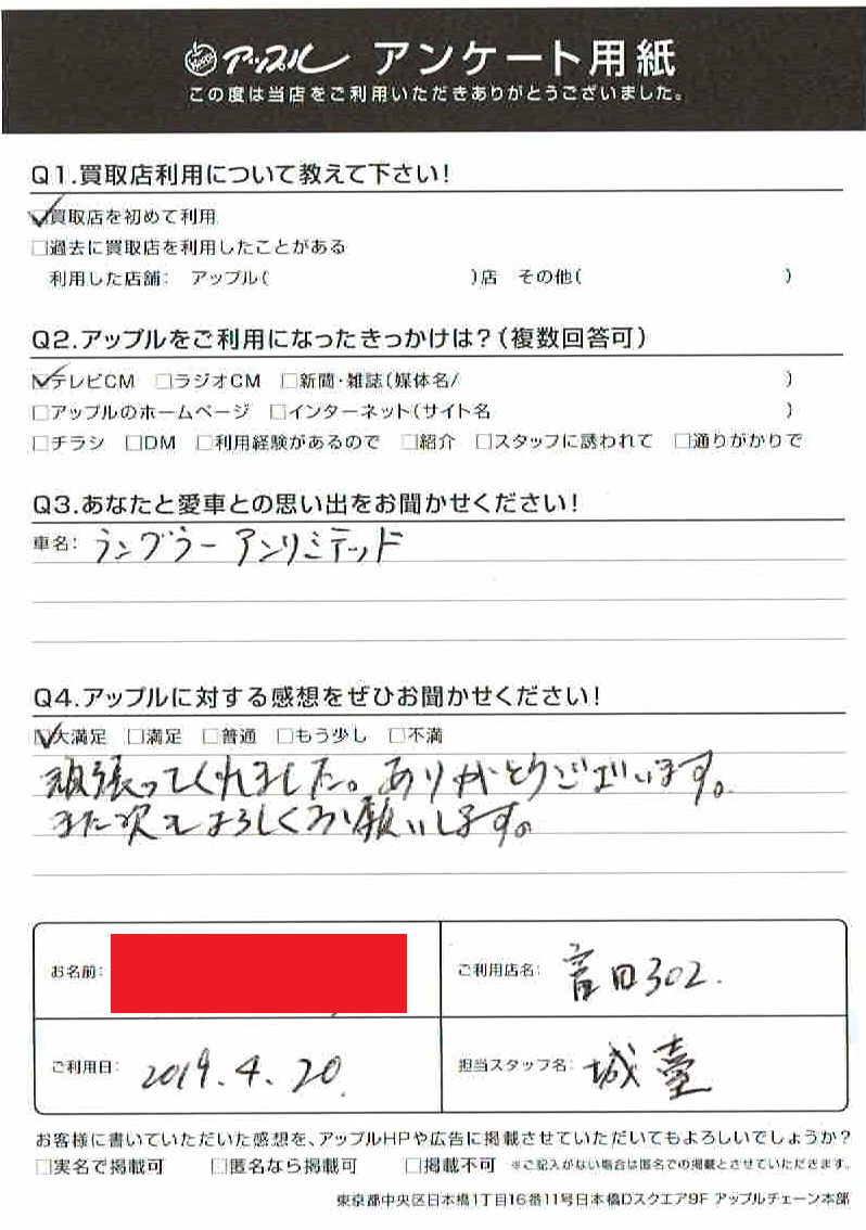 お車のご相談・ 査定だけでもOK! カンタン 入力 30秒 アップルがブランド買取始めました! お電話でも受付中! 受付時間AM10:00~PM7:00(毎週水曜日店休) 052-304-0136 お車のご相談・ 査定だけでもOK! カンタン 入力 30秒 アップルがブランド買取始めました! お電話でも受付中! 受付時間AM10:00~PM7:00(毎週水曜日店休) 052-304-0136 アップルがブランド買取始めました! お電話でも受付中! 受付時間AM10:00~PM7:00(毎週水曜日店休) 052-304-0136 店舗情報 在庫車 スタッフ紹介 ブログ お客様の声 キャンペーン 無料査定 click お客様の声 ご記入日: 2019/04/20 匿名ラングラー様 車名:ジープ ラングラー 頑張ってくれました。ありがとうございます。また次もよろしくお願いします。 前へ 次へ お客様の声一覧を見る