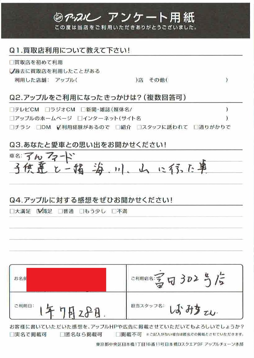 お車のご相談・ 査定だけでもOK! カンタン 入力 30秒 アップルがブランド買取始めました! お電話でも受付中! 受付時間AM10:00~PM7:00(毎週水曜日店休) 052-304-0136 お車のご相談・ 査定だけでもOK! カンタン 入力 30秒 アップルがブランド買取始めました! お電話でも受付中! 受付時間AM10:00~PM7:00(毎週水曜日店休) 052-304-0136 アップルがブランド買取始めました! お電話でも受付中! 受付時間AM10:00~PM7:00(毎週水曜日店休) 052-304-0136 店舗情報 在庫車 スタッフ紹介 ブログ お客様の声 キャンペーン 無料査定 click お客様の声 ご記入日: 2019/07/28 匿名希望アルファード様 車名:トヨタ アルファード(H27年1月~のHYBRID含む) 子供達と一緒に海、川、山に行った車 前へ 次へ お客様の声一覧を見る