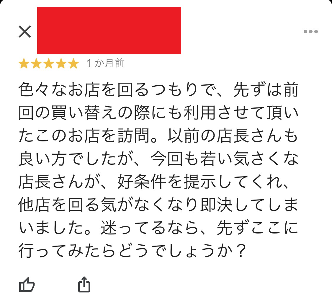 以前の店長さんも良い方でしたが、今回も若い気さくな店長さんが、好条件を提示してくれ、他店を回る気がなくなり即決してしまいました。