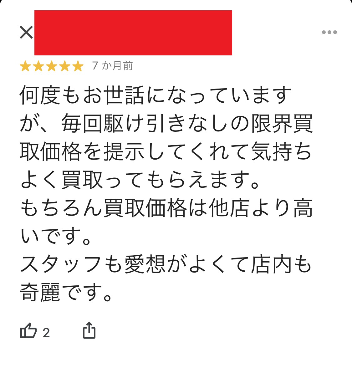 何度かお世話になっていますが、毎回駆け引きなしの限界買取価格を提示してくれて気持ちよく買い取ってもらえます。