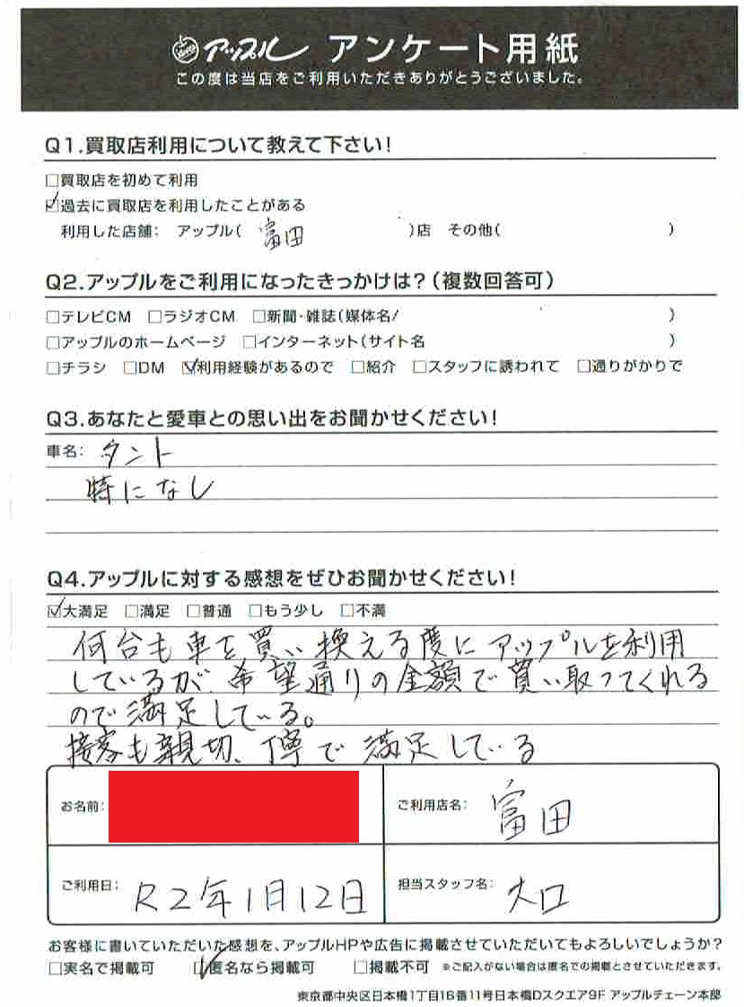 お車のご相談・ 査定だけでもOK! カンタン 入力 30秒 アップルがブランド買取始めました! お電話でも受付中! 受付時間AM10:00~PM7:00(毎週水曜日店休) 052-304-0136 お車のご相談・ 査定だけでもOK! カンタン 入力 30秒 アップルがブランド買取始めました! お電話でも受付中! 受付時間AM10:00~PM7:00(毎週水曜日店休) 052-304-0136 アップルがブランド買取始めました! お電話でも受付中! 受付時間AM10:00~PM7:00(毎週水曜日店休) 052-304-0136 店舗情報 在庫車 スタッフ紹介 ブログ お客様の声 キャンペーン 無料査定 click お客様の声 ご記入日: 2020/01/12 匿名希望タント様 車名:ダイハツ タント 何台も車を買い換える度にアップルを利用しているが、希望通りの金額で買い取ってくれるので満足している。接客も親切丁寧で満足している。 前へ 次へ お客様の声一覧を見る