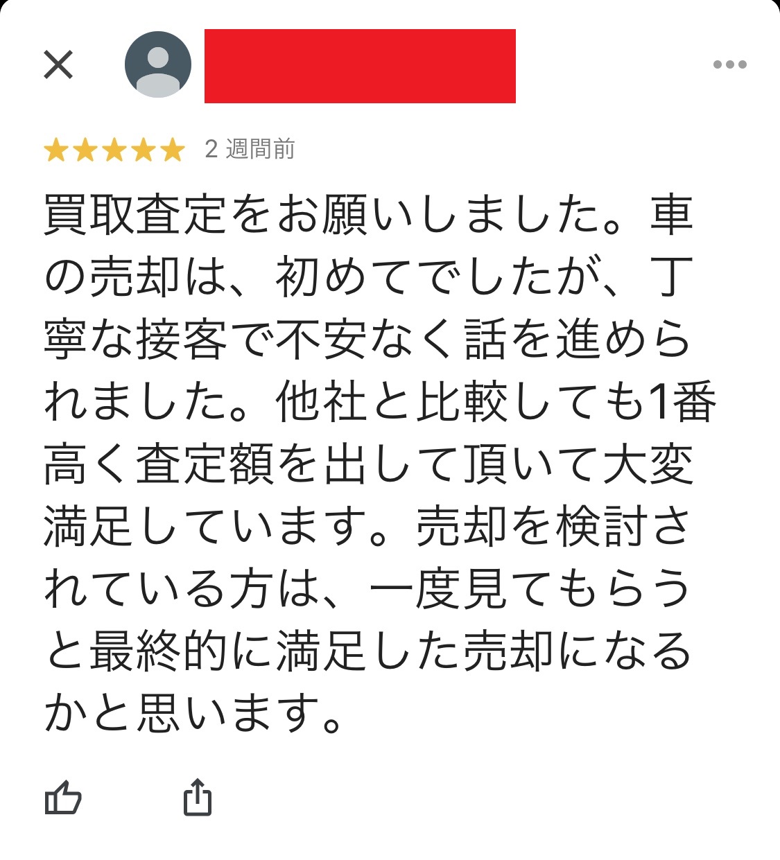買取査定をお願いしました。車の売却は、初めてでしたが、丁寧な接客で不安なく話を進められました。他社と比較しても1番高く査定額を出して頂いて大変満足しています。売却を検討されている方は、一度見てもらうと最終的に満足した売却になるかと思います。