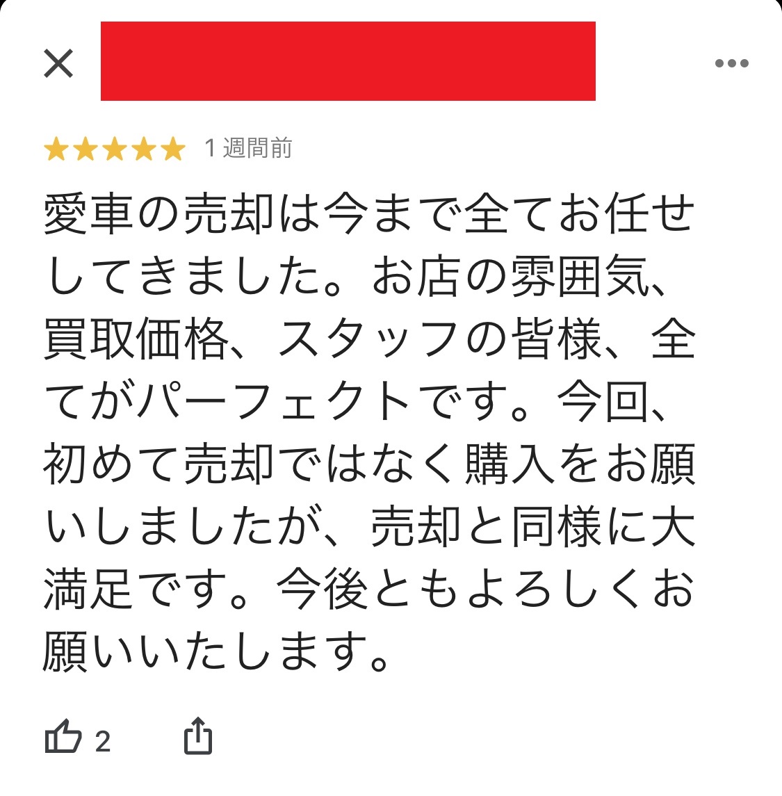 愛車の売却は今まで全てお任せしてきました。お店の雰囲気、買取価格、スタッフの皆様、全てがパーフェクトです。