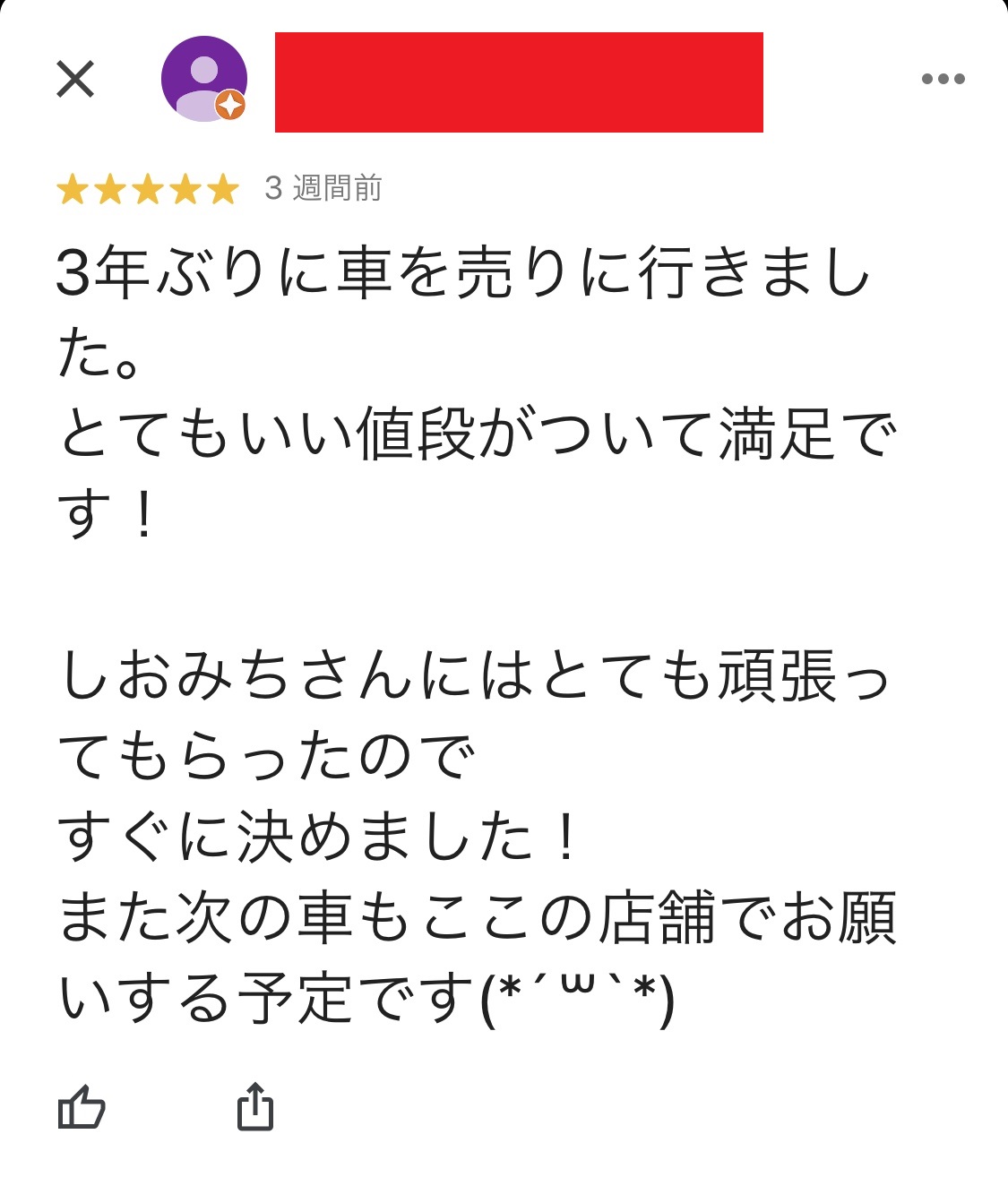 お車のご相談・ 査定だけでもOK! カンタン 入力 30秒 アップルがブランド買取始めました! お電話でも受付中! 受付時間AM10:00~PM7:00(毎週水曜日店休) 052-304-0136 お車のご相談・ 査定だけでもOK! カンタン 入力 30秒 アップルがブランド買取始めました! お電話でも受付中! 受付時間AM10:00~PM7:00(毎週水曜日店休) 052-304-0136 アップルがブランド買取始めました! お電話でも受付中! 受付時間AM10:00~PM7:00(毎週水曜日店休) 052-304-0136 店舗情報 在庫車 スタッフ紹介 ブログ お客様の声 キャンペーン 無料査定 click お客様の声 ご記入日: 2020/07/11 匿名希望ノア様 車名:トヨタ ノア 3年ぶりに車を売りに行きました。とてもいい値段がついて満足です!しおみちさんにはとても頑張ってもらったのですぐに決めました!まつ次の車もここの店舗でお願いする予定です。 前へ 次へ お客様の声一覧を見る
