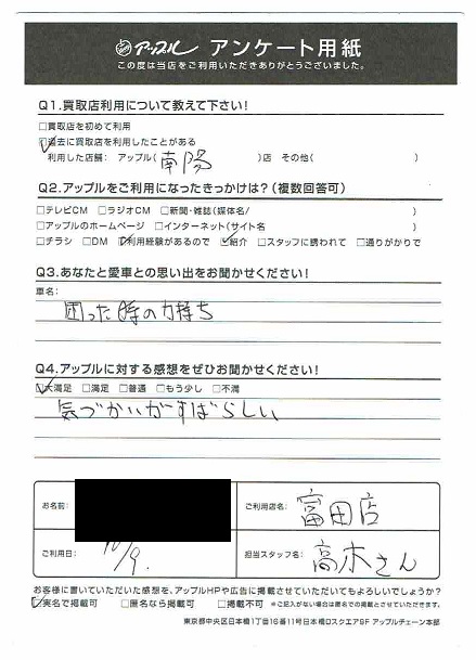 お車のご相談・ 査定だけでもOK! カンタン 入力 30秒 アップルがブランド買取始めました! お電話でも受付中! 受付時間AM10:00~PM7:00(毎週水曜日店休) 052-304-0136 お車のご相談・ 査定だけでもOK! カンタン 入力 30秒 アップルがブランド買取始めました! お電話でも受付中! 受付時間AM10:00~PM7:00(毎週水曜日店休) 052-304-0136 アップルがブランド買取始めました! お電話でも受付中! 受付時間AM10:00~PM7:00(毎週水曜日店休) 052-304-0136 店舗情報 在庫車 スタッフ紹介 ブログ お客様の声 キャンペーン 無料査定 click お客様の声 ご記入日: 2020/10/09 匿名様 車名:トヨタ ノア 愛車との思い出:困った時の力持ち感想:大満足 気づかいが素晴らしい 前へ 次へ お客様の声一覧を見る