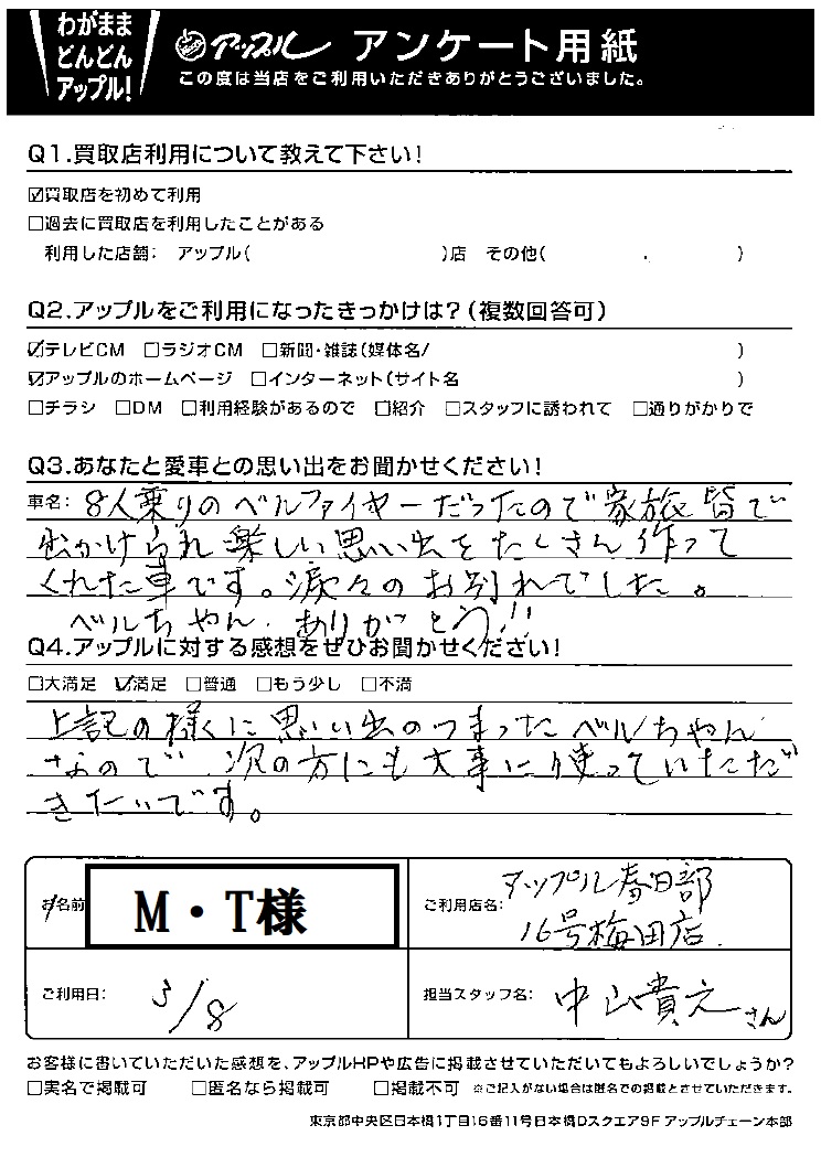 A.8人乗りのヴェルファイアだったので、家族皆で出かけられ楽しい思い出をたくさん作ってくれた車です。涙々のお別れでした。ヴェルちゃんありがとう!!