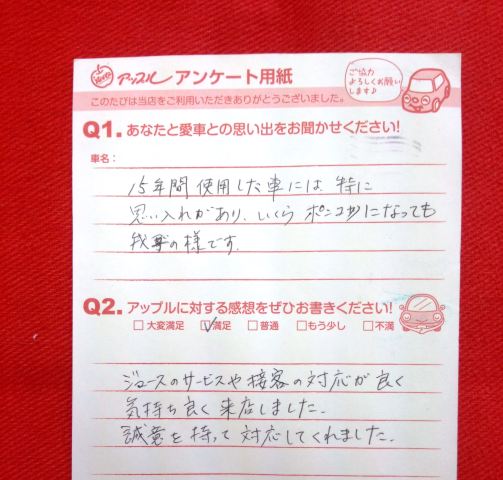 お車のご相談・ 査定だけでもOK! カンタン 入力 30秒 アップルがブランド買取始めました! お電話でも受付中! 受付時間10:00 ~ 19:00 0532-64-5911 お車のご相談・ 査定だけでもOK! カンタン 入力 30秒 アップルがブランド買取始めました! お電話でも受付中! 受付時間10:00 ~ 19:00 0532-64-5911 アップルがブランド買取始めました! お電話でも受付中! 受付時間10:00 ~ 19:00 0532-64-5911 店舗情報 在庫車 スタッフ紹介 ブログ お客様の声 キャンペーン 無料査定 click お客様の声 ご記入日: 2013/09/06 匿名様 先日はご来店誠にありがとうございました。お客様が今まで愛車を大切にされていたのが、よくわかりました。これからもよろしくお願いいたします。 前へ 次へ お客様の声一覧を見る