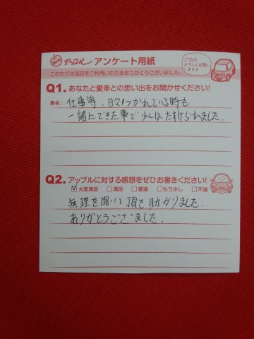 お車のご相談・ 査定だけでもOK! カンタン 入力 30秒 アップルがブランド買取始めました! お電話でも受付中! 受付時間10:00 ~ 19:00 0532-64-5911 お車のご相談・ 査定だけでもOK! カンタン 入力 30秒 アップルがブランド買取始めました! お電話でも受付中! 受付時間10:00 ~ 19:00 0532-64-5911 アップルがブランド買取始めました! お電話でも受付中! 受付時間10:00 ~ 19:00 0532-64-5911 店舗情報 在庫車 スタッフ紹介 ブログ お客様の声 キャンペーン 無料査定 click お客様の声 ご記入日: 2014/04/02 匿名様 ●愛車との思い出 仕事等、日々疲れている時も一緒にできた事で少しはたすけられました。●アップルに対する感想 無理を聞いて頂き助かりましたありがとうございました。 前へ 次へ お客様の声一覧を見る