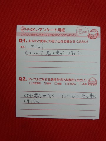 お車のご相談・ 査定だけでもOK! カンタン 入力 30秒 アップルがブランド買取始めました! お電話でも受付中! 受付時間10:00 ~ 19:00 0532-64-5911 お車のご相談・ 査定だけでもOK! カンタン 入力 30秒 アップルがブランド買取始めました! お電話でも受付中! 受付時間10:00 ~ 19:00 0532-64-5911 アップルがブランド買取始めました! お電話でも受付中! 受付時間10:00 ~ 19:00 0532-64-5911 店舗情報 在庫車 スタッフ紹介 ブログ お客様の声 キャンペーン 無料査定 click お客様の声 ご記入日: 2014/04/02 匿名様 ●愛車との思い出 アリスト気に入って長く乗っていました。●アップルに対する感想 とても感じが良く、アップルに売ることにしました。 前へ 次へ お客様の声一覧を見る