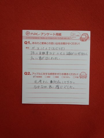 お車のご相談・ 査定だけでもOK! カンタン 入力 30秒 アップルがブランド買取始めました! お電話でも受付中! 受付時間10:00 ~ 19:00 0532-64-5911 お車のご相談・ 査定だけでもOK! カンタン 入力 30秒 アップルがブランド買取始めました! お電話でも受付中! 受付時間10:00 ~ 19:00 0532-64-5911 アップルがブランド買取始めました! お電話でも受付中! 受付時間10:00 ~ 19:00 0532-64-5911 店舗情報 在庫車 スタッフ紹介 ブログ お客様の声 キャンペーン 無料査定 click お客様の声 ご記入日: 2014/04/06 匿名様 ●愛車との思い出 スパイク(モビリオ)孫の自転車などのせて遊びに行きたく、広い車が欲しかった。●アップルに対する感想 元気よく対応してくださいました。なかなか良い感じでした。 前へ 次へ お客様の声一覧を見る
